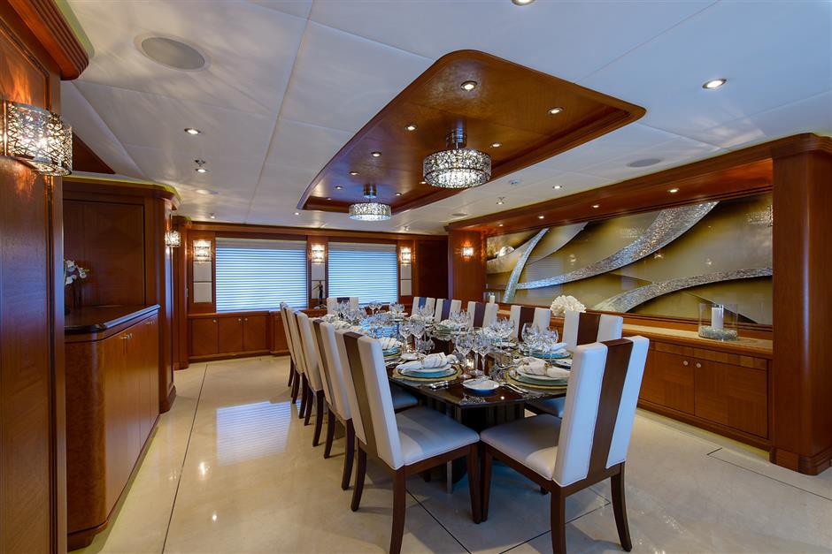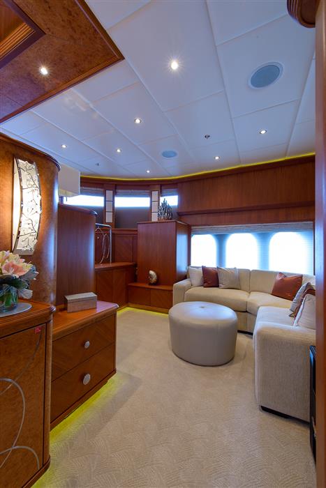 SKYFALL has a contemporary and luxurious interior, finished in Honduran Mahogany, Maple Burl and Wenge, designed by the award winning Patrick Knowles, allowing for an elegant, yet comfortable atmosphere. She can accommodate a party of 17 in seven state rooms.