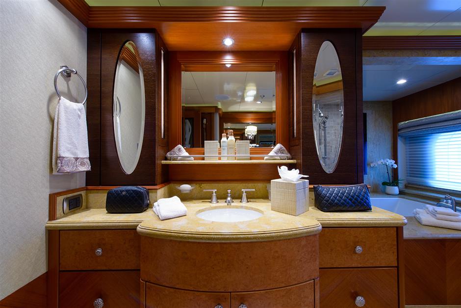 Step aboard Skyfall and see this for yourself. Notable features include a sumptuous split level master suite with his and hers baths offering 270 degree panoramic views, a full beam VIP suite, 5 additional staterooms, an elevator, gorgeous sky lounge, a gym and ultra comfortable living area.